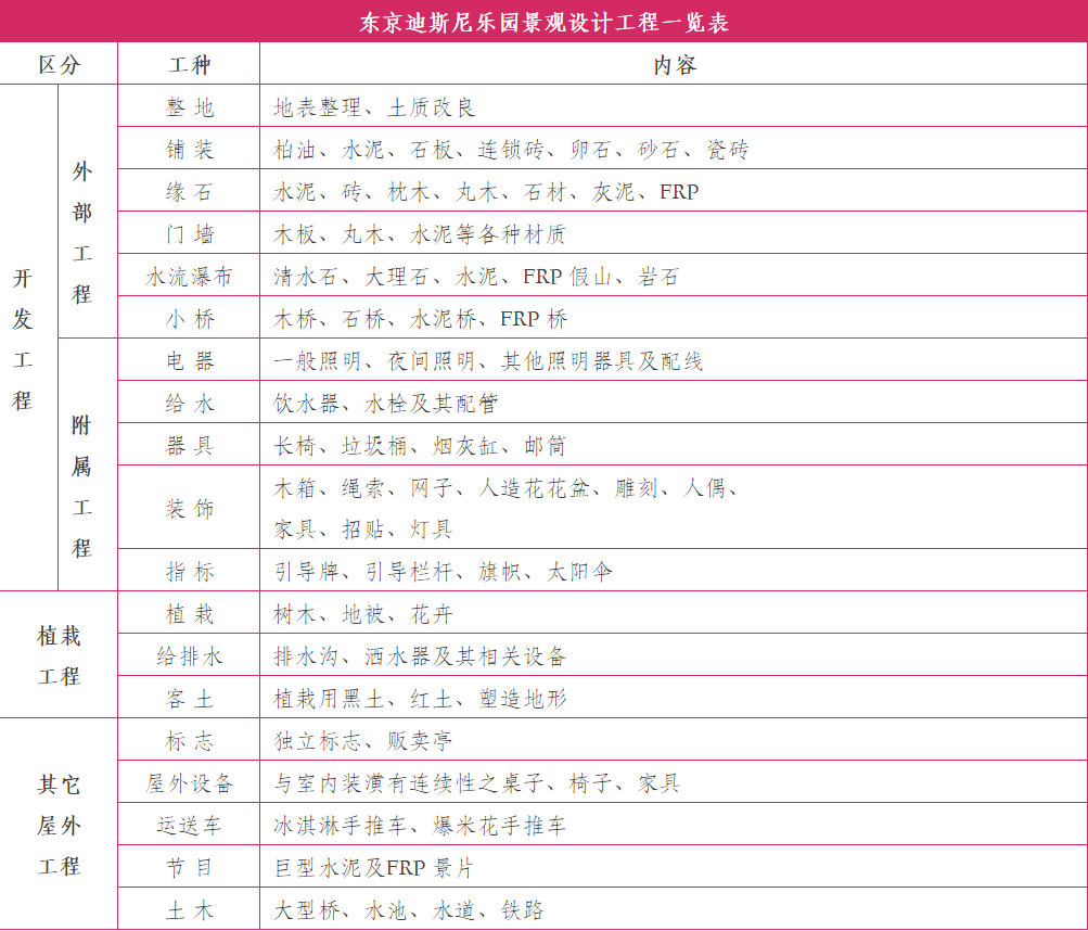 8. 绿色的演出:台湾四季如春,浓绿的山色和行道树一年到头几乎很少变化,因此主题公园内的植栽可考虑搭配不同树种,营造颜色、形状及高低不同的变化层次。以东京迪士尼乐园为例, 其即在不同的区域,种植不同的植物,营造符合情境或主题所要求的景观, 简述如下: