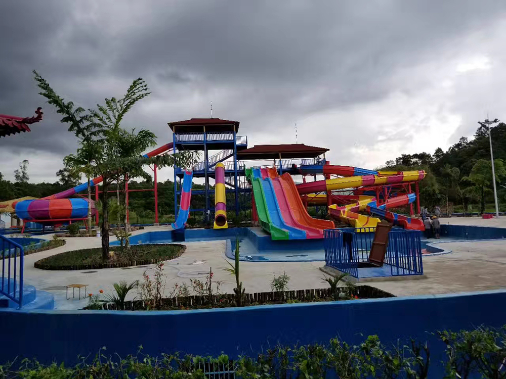 彩虹波浪滑梯(四道):平台高7m的四道彩虹波浪滑道并驾齐驱,适合与朋友同行体验,几人同时从平台出发,争先到达终点,在体验滑梯的同时还能与朋友互动,增添了一种别样的乐趣。彩虹滑道具有独特的视觉魅力以及互动功能,能够吸引并且接待大量客流,是建造水上乐园滑梯的首选。