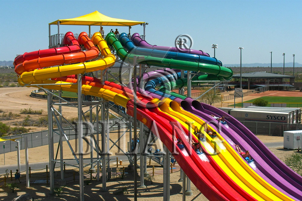 游客首先进入一段封闭螺旋滑道,到滑道直行段的时候突然变成敞开滑道,通过加速段之后进入缓冲槽逐渐减速。相比彩虹波浪滑梯,疾驰竞赛滑梯会让游客感到更加有趣和刺激!