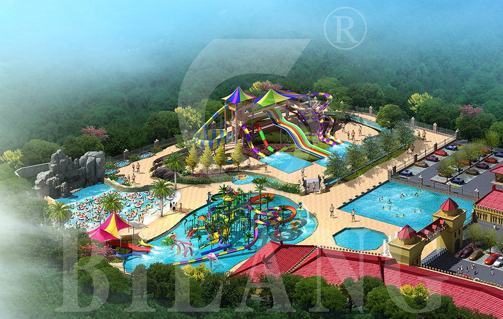 戏水池:面积约1500㎡,大型水寨(35m*30m*13m),家庭滑梯(三滑道,1.6m),